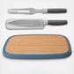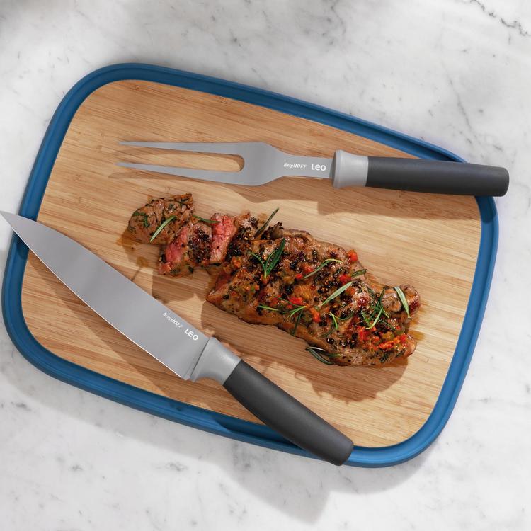 Slicing or carving ham, turkey, chicken, etc., has never been easier than with this complete carving set. The carving fork easily holds your meat, fish or poultry securely in place while you cut precise slices with the sharp stainless steel carving fork. The blade's non-stick coating ensures the food doesn't stick to the knife while the fork and knife's soft touch handle ensures a comfortable grip for easy handling. The stylish bamboo cutting board is strong but lightweight and has an integrated juice groove that catches juices as you cut and carve. Set comes with 1x bamboo board, 1x carving knife, 1x carving fork