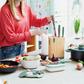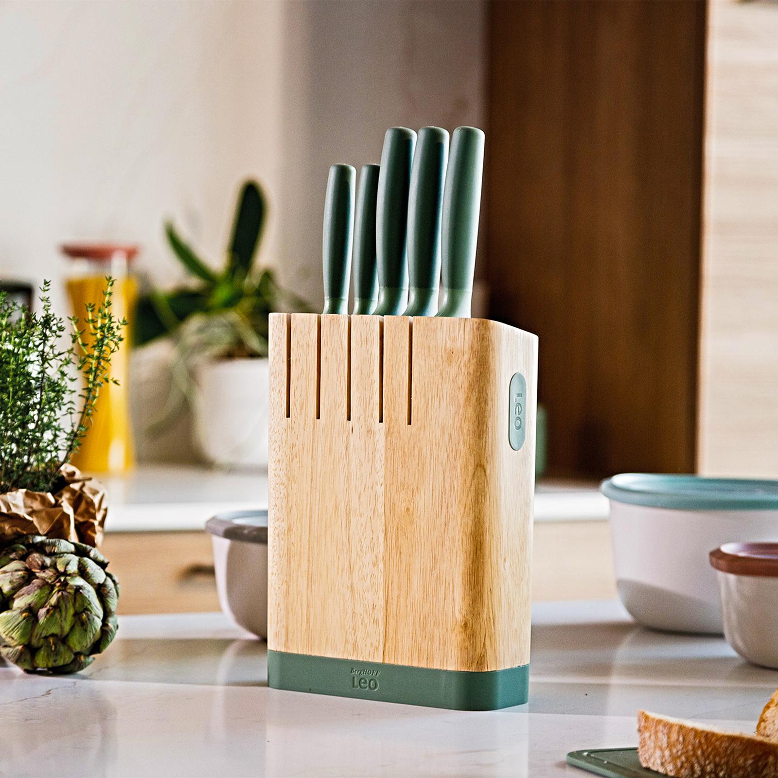 This knife block with built-in sharpener is the way to go! This versatile and innovative set contains a hand-sharpened stainless steel all type of knives. In the beautiful wooden knife block, you can conveniently keep all knives organized and within reach for effortless food preparation. Keep your knives razor sharp by using the handy built-in sharpener, available at all times. The integreated strong magnet on the side allows convenient storage for your scissors. The knives feature an ergonomic soft-touch handle for a comfortable grip.