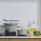 Leo Balance 3Pc Steamer Set is built with sustainable and healthy non-toxic, PTFE free, PFAS free non-stick CeraGreen ceramic coating, recycled aluminum and stay-cool handle for no oil, no fat cooking. Boil pasta, simmer soups, or slow-cook stocks with confidence! The pot is made from 100% recycled Aluminum body and full disk bottom that guarantee fast and even heat distribution for energy efficiency, suitable for all cooktops. Its soft-touch and stay-cool handle provides a good grip so you can safely take the pan from the stove to the table for serving. The versatile collapsible steamer insert is crafted from heat-resistant silicone and can be folded down to turn any 10" pot into a steamer. The glass lid allows you to keep an eye on cooking without having to lift the lid while the knob on the lid is equipped with a spoon rest to keep kitchen clean while cooking.