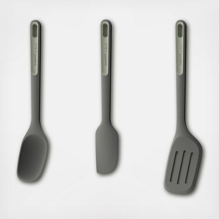 LEO Balance Cook & Serve Utensil Set is perfect for every meal. This set is nonstick and is made with recycled plastics. The turner has a thin flexible edge that can easily slide under all foods and is safe for use in non-stick coated cookware. The three slots allow excess liquid and oil to drain from your food. The spatula is perfect for stirring, folding, mixing and scraping. It is also heat-resistant up to 420F. Serve up mashed potatoes, rice or stews in a jiffy with the Leo serving spoon that's partly made with recycled plastic! The heat-resistant lightweight silicone spoon won’t scratch your delicate cookware while the soft-touch rubber handle ensures a comfortable grip when you’re scooping up your ingredients.