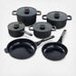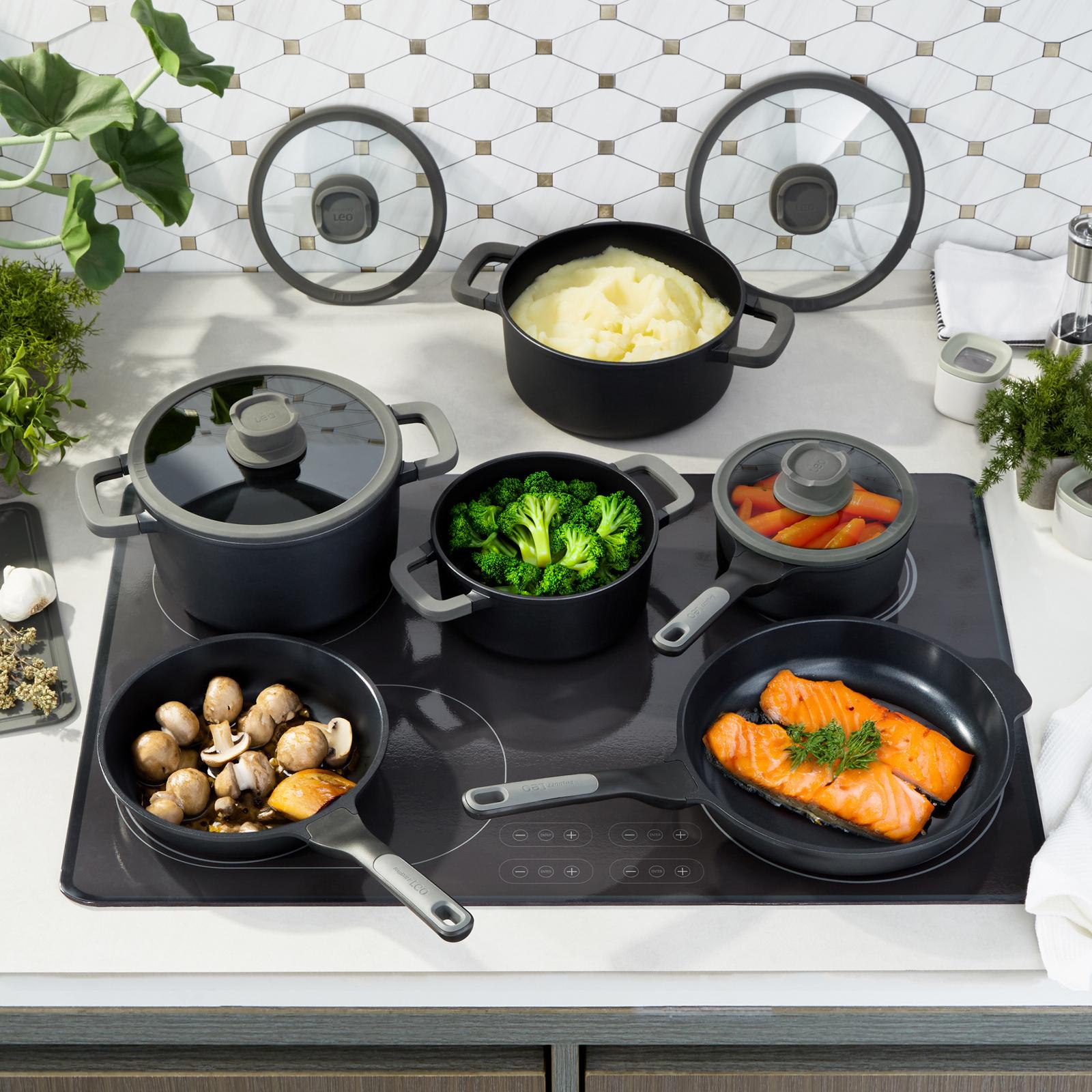 Leo Stone+ 10pc Cookware Set is not only functional but also environmentally friendly, as it is made from recycled aluminum and coated with CeraGreen's nonstick, nontoxic PFAS-free and PTFE-free ceramic coating. The pots and pans are also lightweight, making them easy to handle and maneuver while cooking. The stockpots are perfect for making soups, stews, and boiling pasta, while the saucepan is great for heating up sauces and gravies. The sauté pan is ideal for searing meats and vegetables, while the fry pans are perfect for frying eggs, pancakes, and other breakfast items. The included lids feature a built-in spoon rest as well as an integrated straining hole for easy, energy-efficient cooking. Designed to suit all kinds of heat sources such as Induction, Electric, Gas, Halogen, vitro-ceramic, and downdraft cooktops. Can be transferred from Stovetop to Oven to Table. Pots are oven safe up to 440°F without the sleeves.