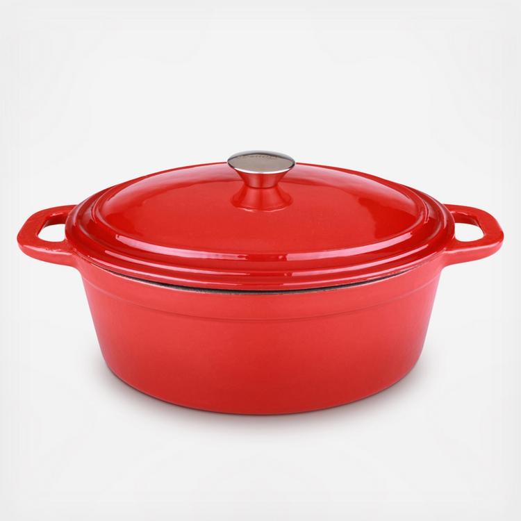The Neo Cast Iron Red Oval dish is a modern collection that marries function, design and innovative use of materials to create an outstanding line of cast iron cookware. The Neo cast iron is marked by pure lines giving each product its own identity and functionality. The covered casseroles are ideal for slow cooking stews, braising, baking and so much more. It is enameled inside and out and suitable for all heat sources including, gas, electric, induction and ceramic.