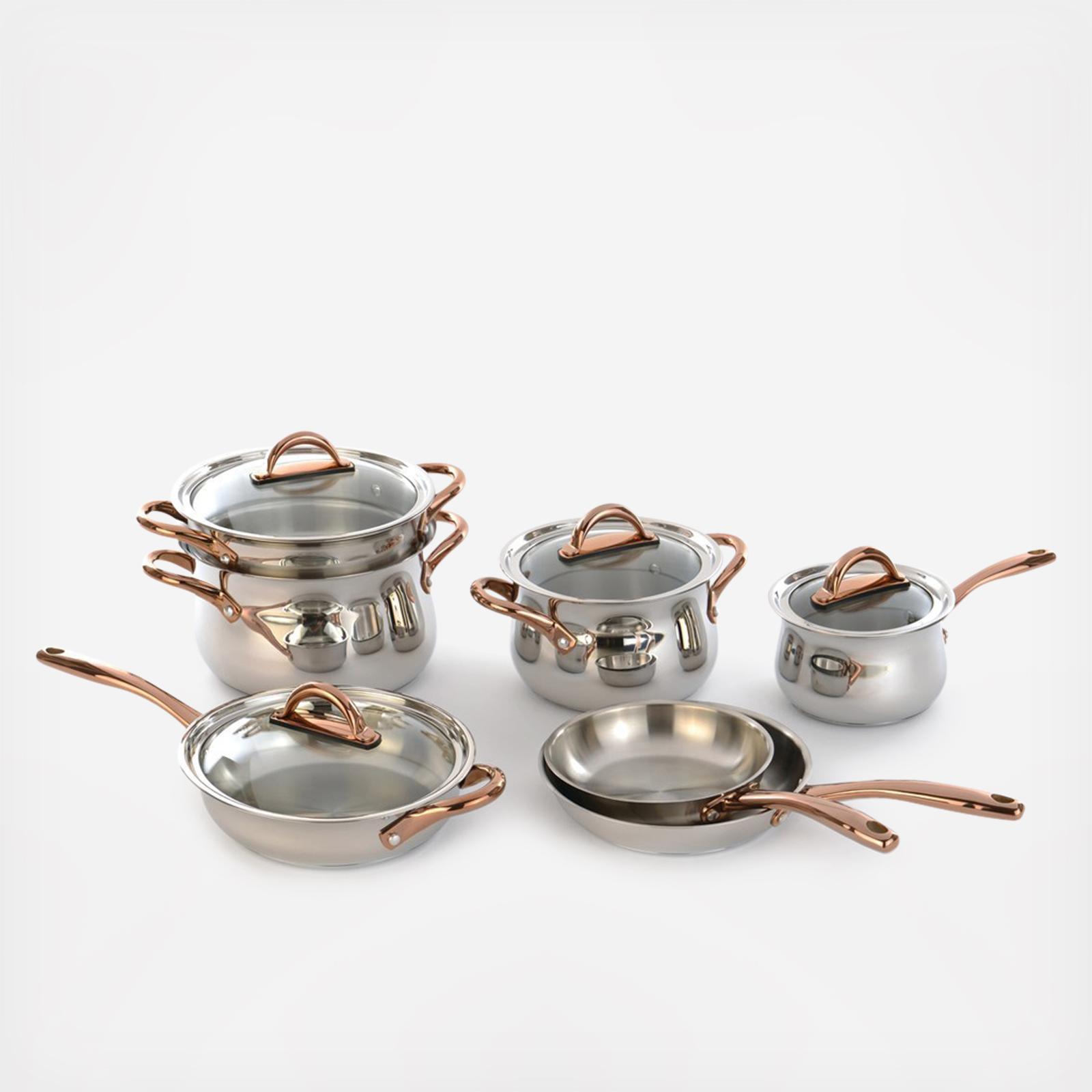 The Ouro Gold 11-Piece Covered Cookware Set has exceptional functionality and bold beauty. Featuring high-polish copper coated stainless steel accents and rose gold handles with ergonomic handles, this line was designed for optimal durability and cooking versatility. Constructed from durable 18/10 stainless steel, BergHOFF's cookware is built to withstand a lifetime of heavy use with a fast, simple cleanup. Ouro also comes induction-ready and guarantees the finest culinary experience. Dishwasher Safe. Set