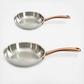 Ouro Gold 2pc Fry Pan Set is a must-have for any kitchen, blending style with practicality. Made from high-quality 18/10 stainless steel, each fry pan features ergonomic rose gold handles that provide a secure and comfortable grip for enhanced safety and control during cooking. Perfect for tasks like flipping pancakes or sautéing vegetables, these pans ensure a smooth and effortless cooking experience. Its multi-layered base ensures even heat distribution so that your food is cooked evenly and thoroughly. Compatible with a wide range of cooktops including Induction, Electric, Gas, Halogen, Glass Top, and Vitro-ceramic. Their sleek, smooth surfaces allow for easy food release and simplified clean-up, reducing the need for extensive scrubbing. With their modern and elegant design, these fry pans not only deliver excellent performance but also add a sophisticated touch to your kitchen. Hand wash recommended.