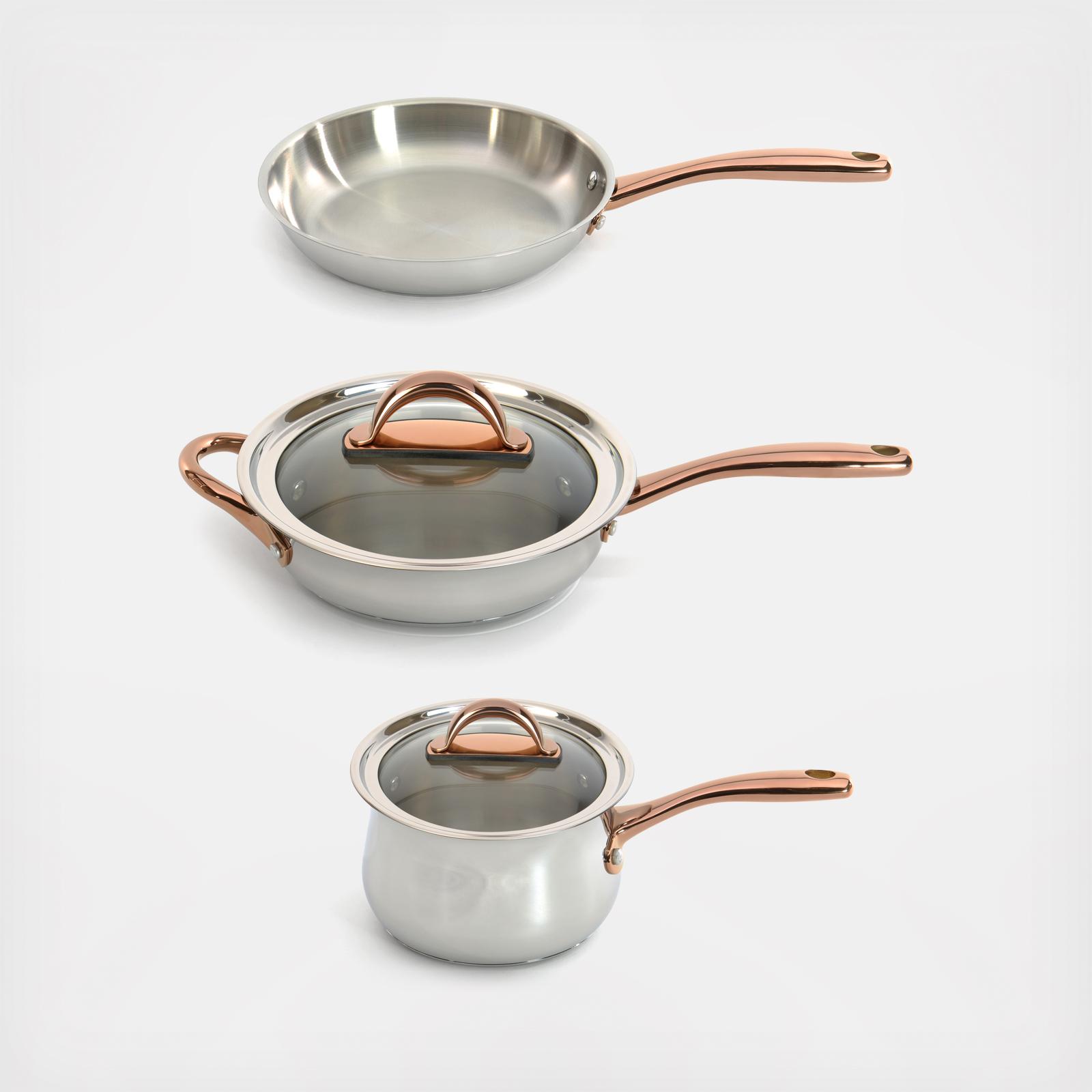 Ouro Gold Cookware, timeless beauty that will last for years. With a mirrored finish, this cookware comes with beautiful rose gold accents on the handles giving this set a unique and attractive look. Professional quality cooking with effortless cleanup. The Ouro Gold 4-Piece Starter Set with lids can be used for a variety of meals. The fry pan crisps up bacon and sears steaks to perfection. Braise carrots, or make your favorite rissoto with ease thanks to the high sides of the covered deep skillet. Use the sauce pan to make your favorite homemade gravy, mashed potatoes, small batches of pasta, and more. The lid allows you to keep a close eye on what is happening in the pot without allowing valuable heat to escape. Durable cookware, designed with versatility and functionality in mind, is built to withstand a lifetime of heavy use in the home. ergonomic, double-riveted stainless steel rose gold handles with copper inlay provide a secure grip. High quality elements were put into every aspect of this cookware. The solid base allows you to use on all cooktops including ceramic, gas, induction, electric, and glass. Please allow cookware to cool completely before attempting to clean.