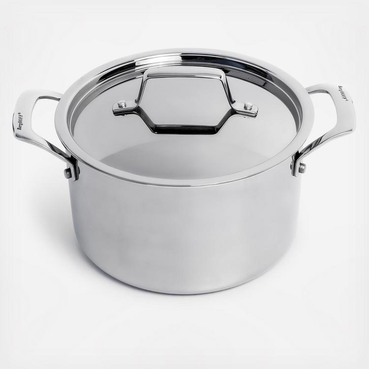 Professional, versatile, high-end straight shape cookware designed for repeated usage by BergHOFF Belgium. Tri-Ply Construction with aluminum core between 18/10 stainless steel & magnetic stainless steel layers for fast and efficient heat conductivity on all sides, not just bottom. The high-quality 18/10 Stainless Steel with 3-layer capsule base is perfect for energy saving and even heat distribution. These pots and pans come with heavy gauge and deep-seated stainless steel lid seals in heat and moisture with sleek professional look. Non porous stainless steel cooking surface is safe for use with all kind of utensils. The convenient capacity marking inside each of pot helps you to control the portion for healthier cooking. Comfortable & elegant cast stainless steel dual riveted handle for extra strength. The polish finished exterior makes it very easy to clean.