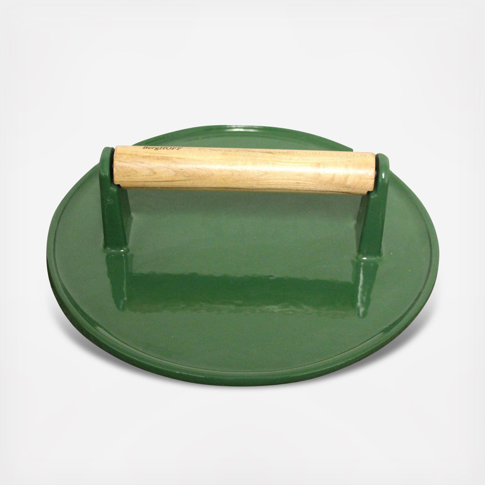 Pre-seasoned and ready to use right from the box, this handy cast-iron grill press ensures that steaks, chops, paninis, and more cook quickly and evenly while pressing away unwanted fat. The stay-cool bamboo handle eliminates the need for bulky oven mitts and potholders.