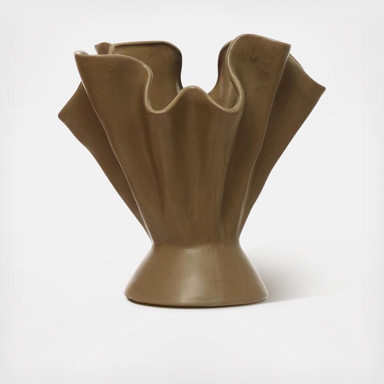 This stunning stoneware vase is handcrafted with a beautiful sage color and a reactive glaze that results in a truly one-of-a-kind piece. The unique ruffled design adds a touch of elegance and artistic flair to any home, and its organic and textured design makes it a perfect fit for nature-inspired, rustic, or farmhouse décor. With its generous dimensions, the vase provides ample space to hold larger floral arrangements or botanical displays. The sturdy stoneware construction ensures durability, and the reactive glaze finish adds a lustrous and eye-catching element to the vase. The vase measures 11.25 inches long, 8.75 inches wide, and 11.25 inches tall. It is made of stoneware and is easy to clean. This vase is a beautiful and versatile addition to any home decor. It would make a wonderful gift for any occasion, and it is sure to be cherished for years to come.