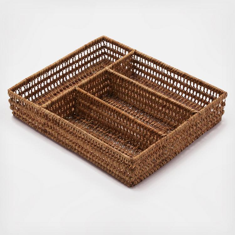 Carly collection radiates Old World charm and simple elegance. Handcrafted from open-weave rattan, this rustic flatware tray has four slots to keep utensils at the ready and beautifully organized.