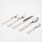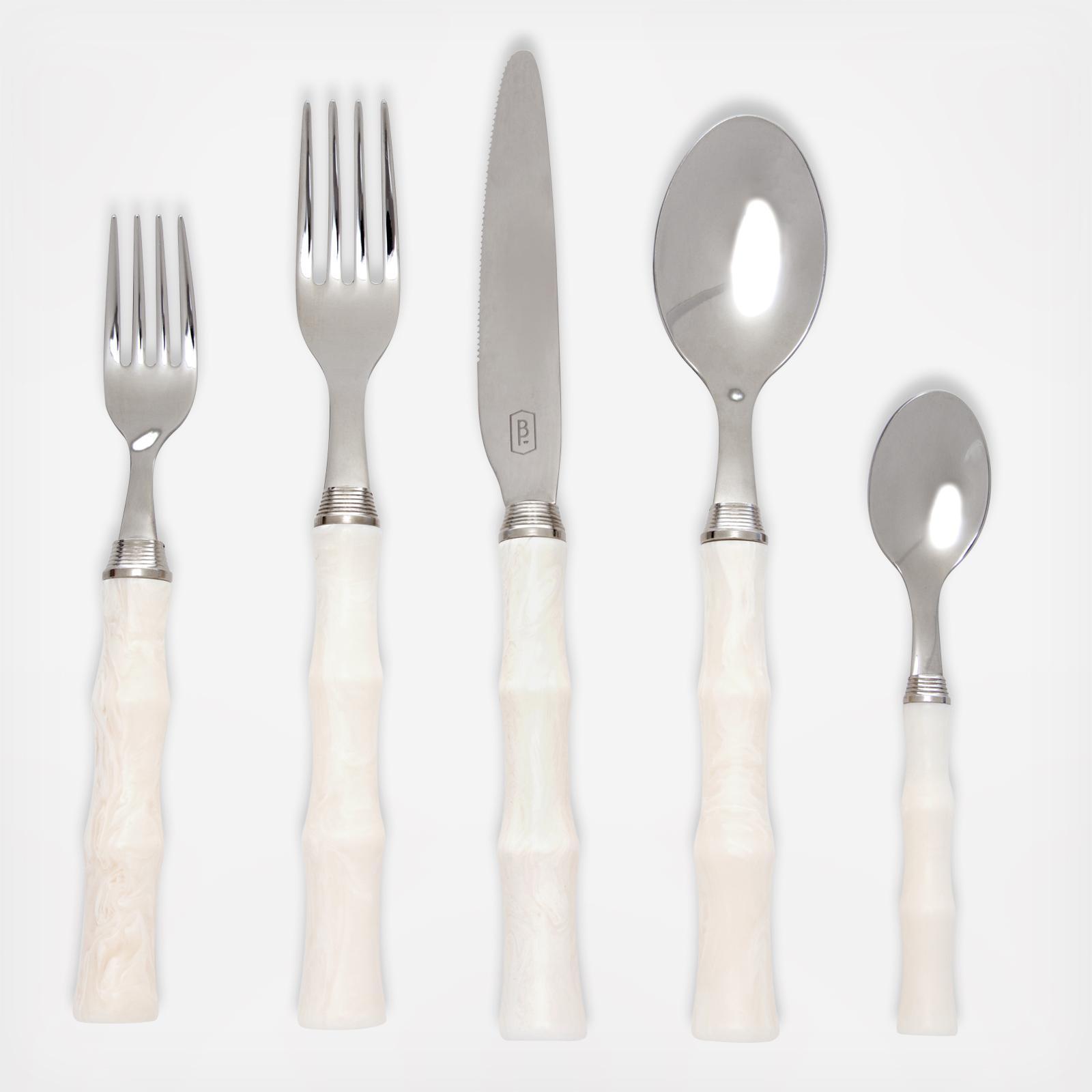 Faux Ivory is carved into the bamboo handles of this stainless steel cutlery set.