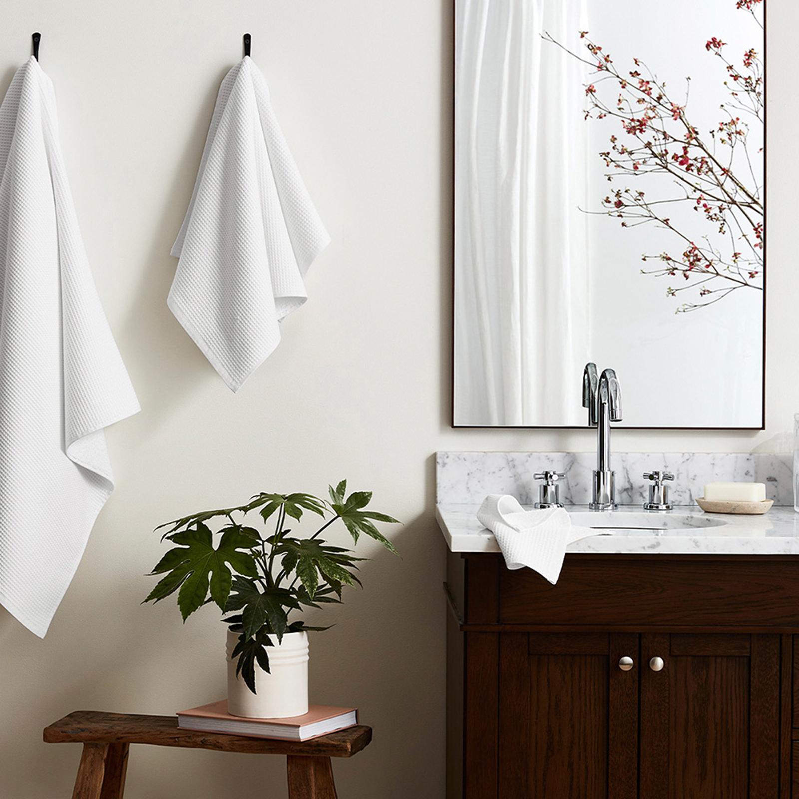 This set of Waffle Terry Hand Towels from Boll & Branch brings the touchable texture of their bestselling Waffle weave into a smaller micro-waffle, and is backed by a sumptuous terry in a dual-sided design. It’s crafted with the highest quality yarns sourced from the finest long-staple 100% organic cotton on earth. The result: a dimensional, midweight bath fabric in a light-yet-absorbent design.