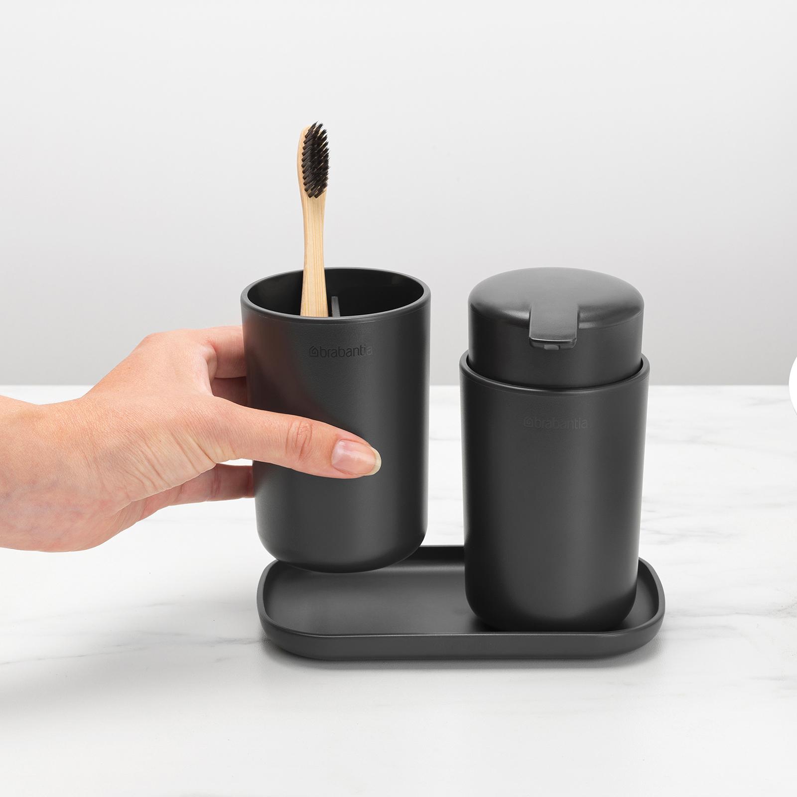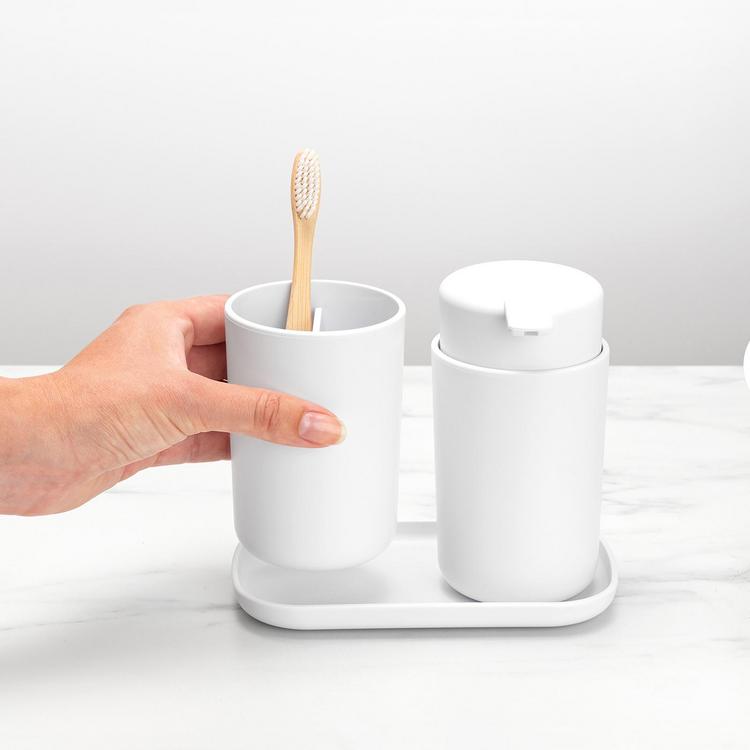 Make your bathroom an oasis of calm by bringing in this stylish ReNew Bathroom Accessory Set of three. The easy-to-fill, non-drip Soap Dispenser keeps your favourite soap at hand while the Toothbrush Holder holds your toothbrushes and toothpaste together. The Tray is there to collect small items or as a coaster for the other two items. An organised and beautiful bathroom - as easy as one, two, three.