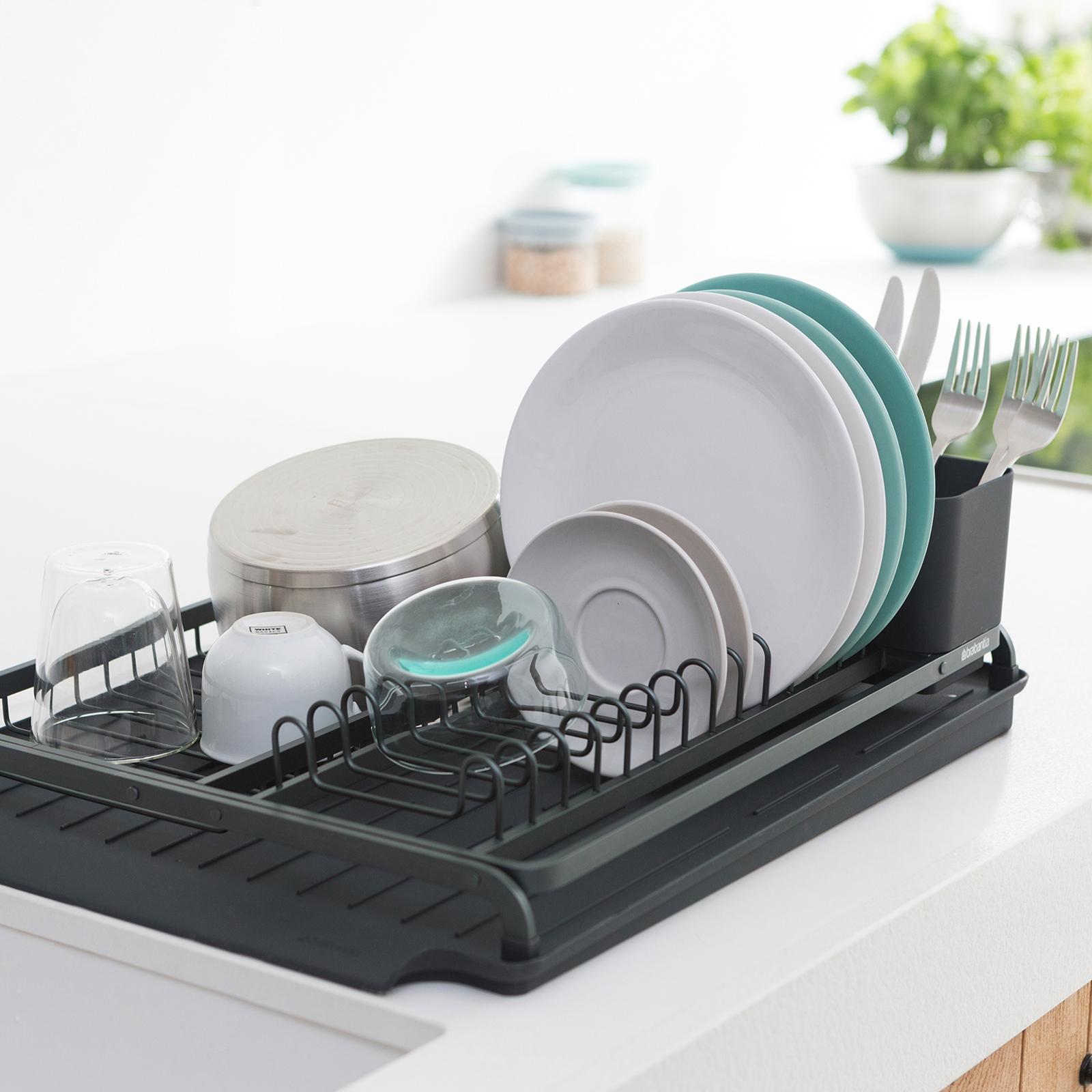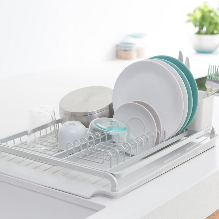 This SinkSide Dish Drying Rack is designed for keeping your dripping dishes. It has a sleek design, but space for up to 13 plates plus bowls, cutlery and glasses. It has a removable cutlery basket and a sloping drip tray too, so drippings run directly into the sink. This rack is on track!