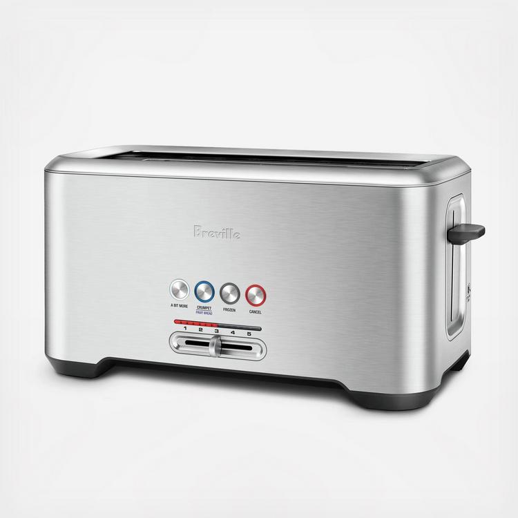 The Bit More 4-slice toaster from Breville includes smart design features that make it easy to toast any bread to perfection. As your bread drops into the extra-long slots and the LED display shows your progress, you’ll feel in control. The "Lift & Look" lever allows you to check on its browning progress without interrupting the toasting cycle, while the "A Bit More" button adds an extra 30 seconds toasting time if you need it. Additionally, the high lift feature raises the carriage approximately a 1/2 inch making it easier to remove smaller items such as English Muffins. Frozen and Bagel buttons complete the package.
