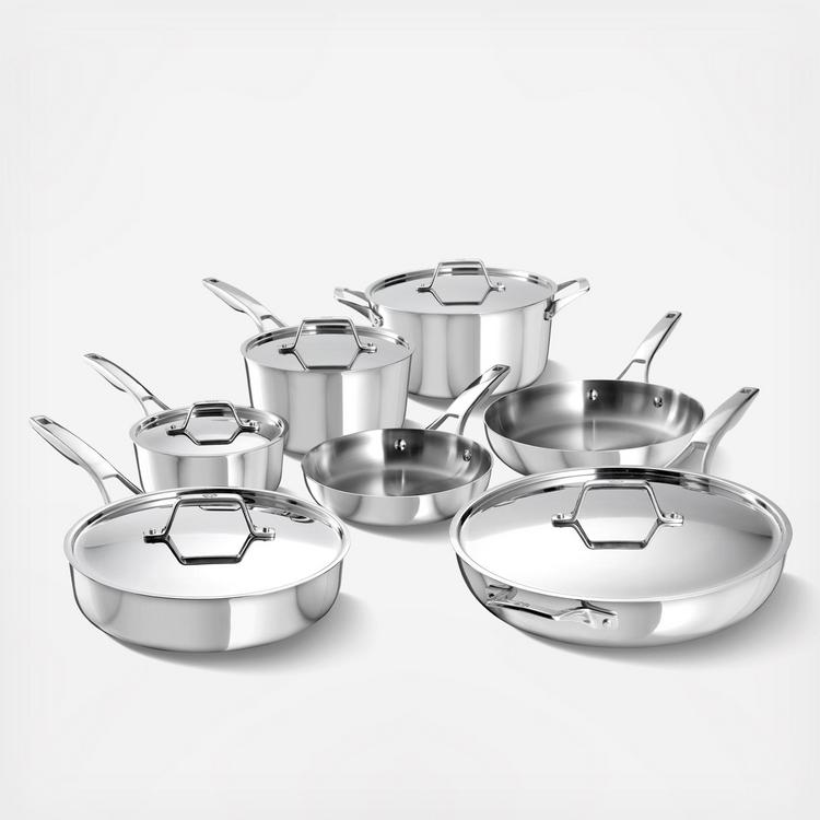 Designed for home chefs who value quality and performance, the Calphalon Premier Stainless Steel 12-Piece Set is built for precision cooking and lasting durability. Engineered with ultra-durable, non-toxic, 5-layer construction and heat-responsive aluminum core, this pan features Calphalon Turbo Temp™ technology and heats up to 30% faster, so you can getting cooking faster. From weeknight dinners to gourmet creations, this professional 12-piece set has everything you need for crowd-pleasing meals. The brushed stainless steel finish adds a professional touch to your kitchen, while its oven-safe, all-stovetop compatibility ensures effortless cooking from start to finish. Cook with ease and bring restaurant-quality performance to you kitchen with Calphalon Premier Stainless Steel cookware. (Calphalon Premier Stainless Steel vs. Cuisinart Professional Series Stainless Steel)