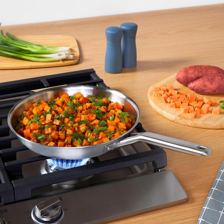 Elevate your kitchen with the Calphalon Stainless Steel 3-Piece Set, crafted for precision cooking and long-lasting durability. Engineered with non-toxic, 3-layer construction and a heat-responsive aluminum core, this cookware set features Calphalon Turbo Temp™ technology and heats up to 30% faster, so you can getting cooking faster. Whether you're whipping up delicate sauces or creating the perfect sear, this 3-piece set delivers flawless results every time. The brushed stainless steel finish adds a professional touch to your cookware collection, while its oven-safe, all-around compatibility ensures seamless cooking on any stovetop. Experience effortless cooking and crowd-pleasing perfection with Calphalon Stainless Steel cookware. (Calphalon Stainless Steel vs. Cuisinart Professional Series Stainless Steel)