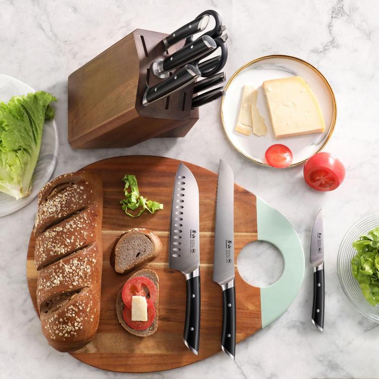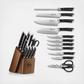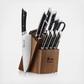 The Helena 12-Piece Knife Block Set is an elegantly minimalist interpretation of the modern kitchen knife. A slim, semi-bolster perfectly balances the knife's full tang while complementing the sleek, smooth lines of the handle. Two stain-resistant steel rivets solidly fasten the ergonomic handle to the blade, providing a secure, comfortable grip. Every blade is forged from high-alloy German X50CrMoV15 steel and meticulously heat treated, ensuring a razor-sharp edge with exceptional durability and edge retention.