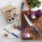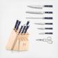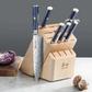 A beautifully-crafted knife block set that will elevate any kitchen. Exceptionally sharp and striking in design, each full-tang X-7 Damascus steel blade features a hammered texture that looks stunning and allows food to slide right off the blade for easy slicing and dicing. The balanced, durable octagonal handle comes in a rich blue and black faux-wood-grain pattern and is complemented and secured by a single mosaic rivet. With 16 slots in this maple wood block, there is a place for the 7 knives that come in the set, plus additional cutlery that needs a home.