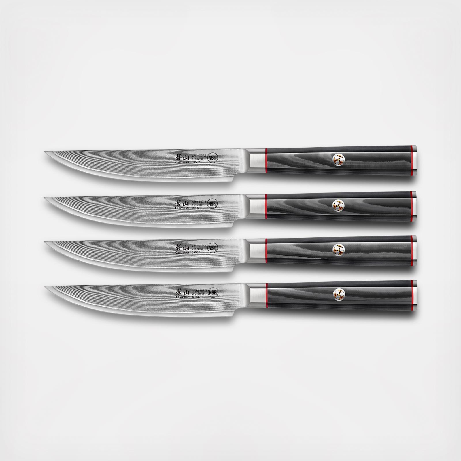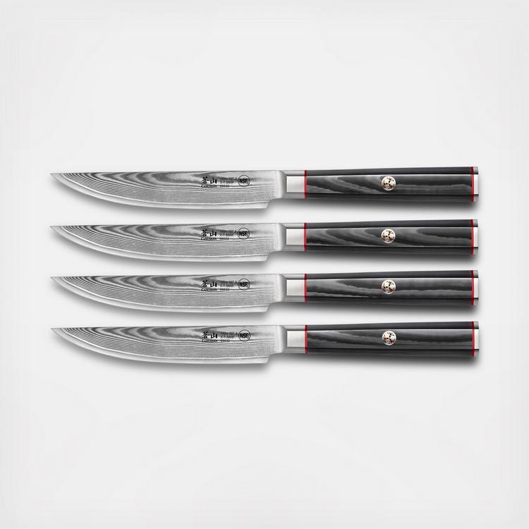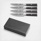 The Yari Steak Knife Set with Wood Box, Set of 4 is a bold statement of traditional design coupled with innovative materials. Exceptionally sharp, striking in design, these hand-sharpened blades feature a unique 67-loyer Damascus pattern across the face of the X-7 high-alloy full-tang blades. Rich, ultra-dense gray G lO handles balance each knife while providing exceptional comfort and precision for the chef. Each knife comes with a rich gray wood magnetic Soya-style sheath that is perfectly shaped to match and protect the knife's distinct blade.