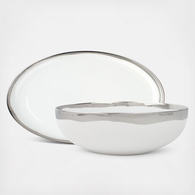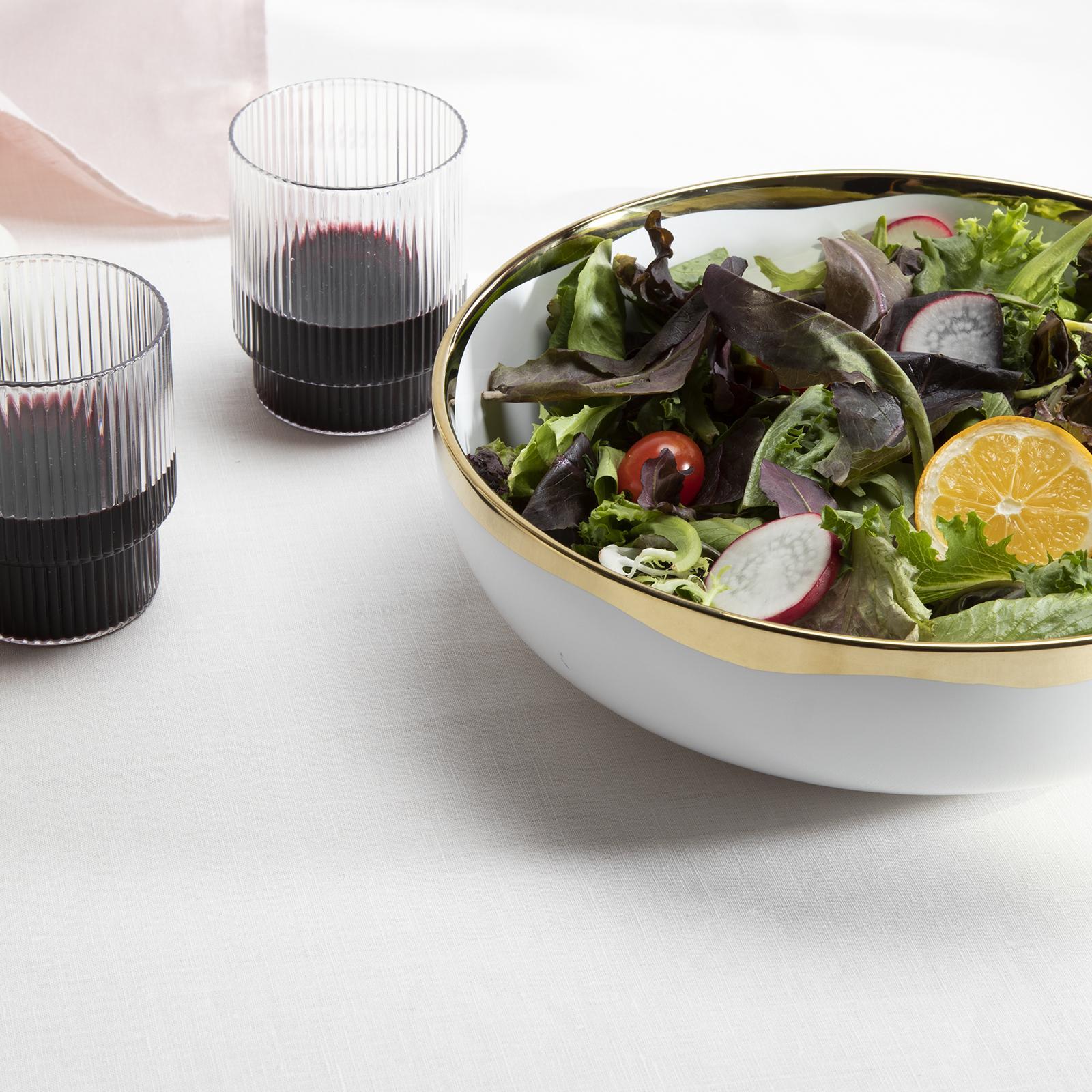 Serve up pastas or salads with a unique combination of glamour and subtlety. Dauville Serving Bowl's exterior is a creamy textured bisque finish which contrasts with the shiny gold or platinum interior and edging. The purposefully irregular metallic glazing reflects the artisan influence of this collection.