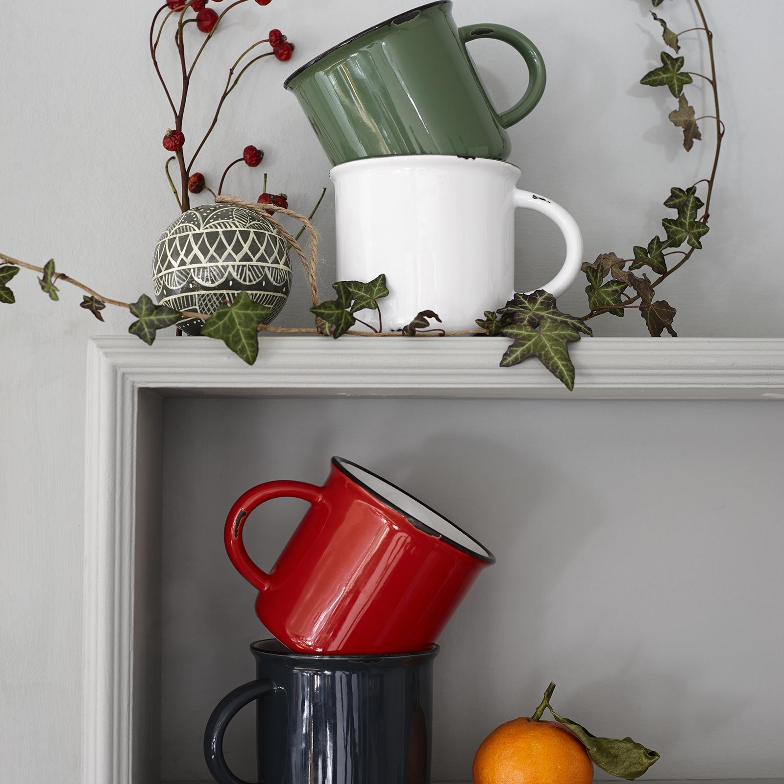 Mimicking vintage metal cookware with the ease and durability of stoneware, the canvas Tinware collection is complete with realistic distressed edges and a contrasting rim. This set of 4 16 oz. capacity mugs is a great addition to your servingware!