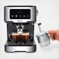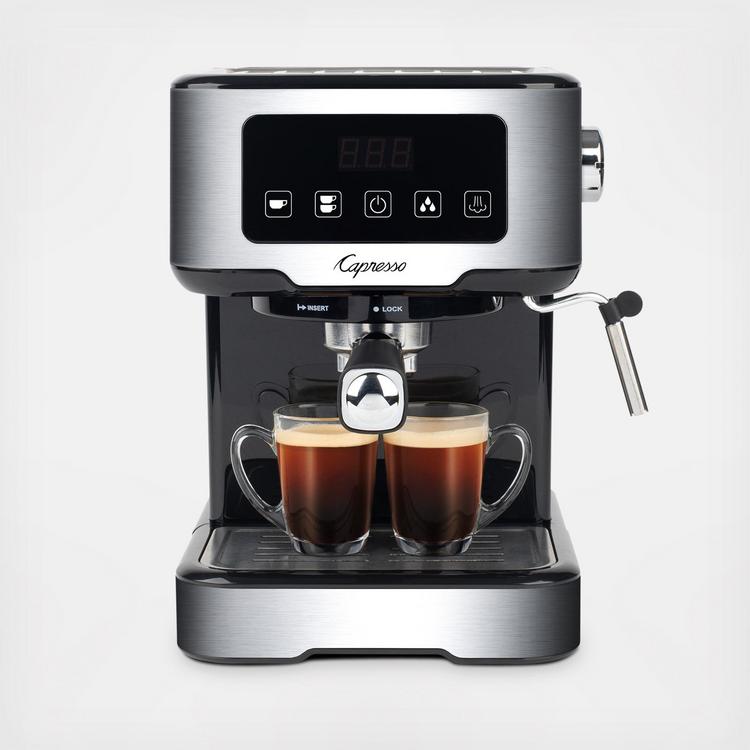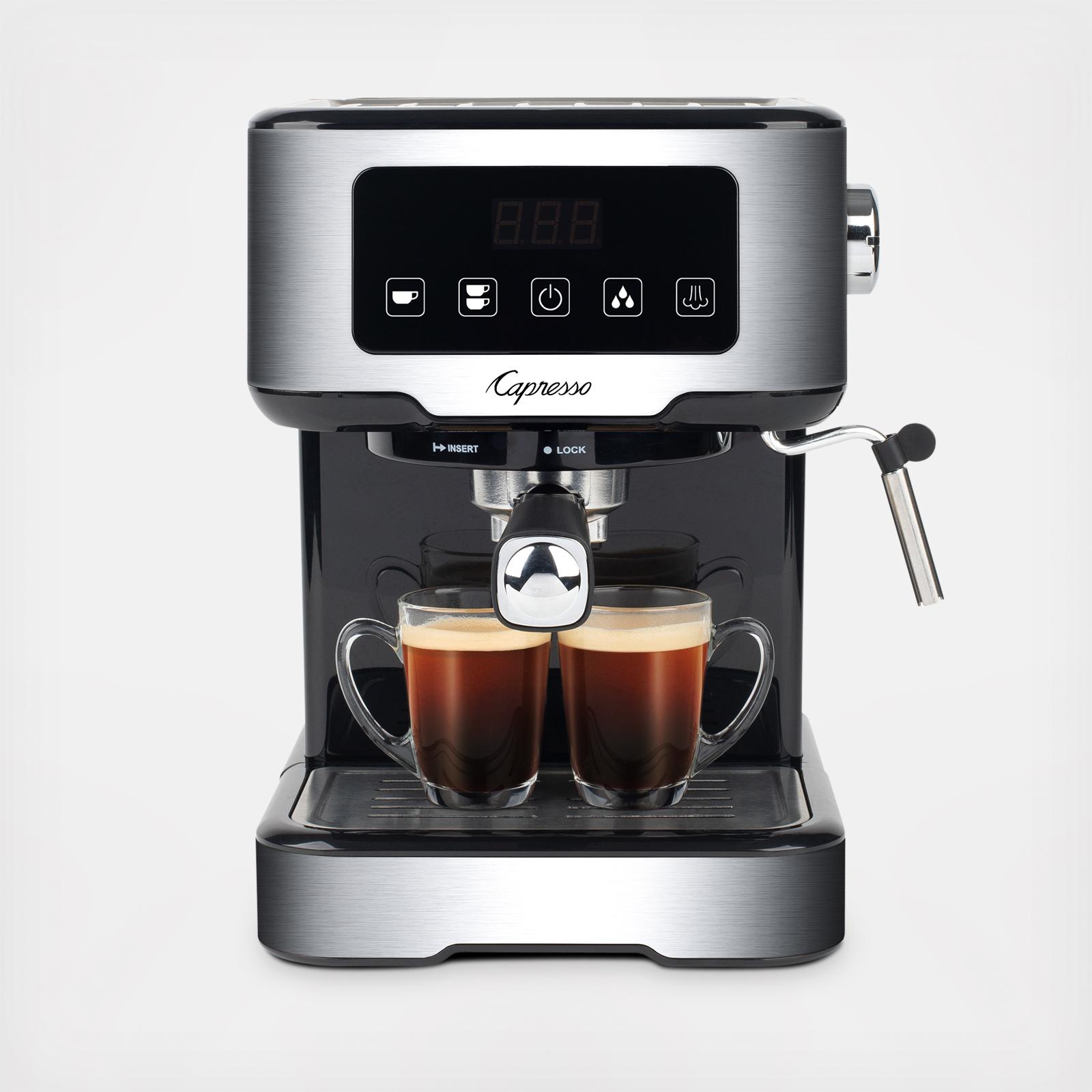 Capresso Programmable Touchscreen espresso machine. The touchscreen panel is siimple to operate and features a count-up timer to monitor brew time. 15 bar Italian pump system provides optimal pressure for rich crema. Stainless steel lined ThermoBlock heating system. Programmable cup sizes and heavy-duty portafilter with two sieves allows brewing for one or two espressos. Hot water function for tea or Americano. Stainless steel frother for foamed milk or remove the sleeve for steamed milk. 50 oz removable water tank with integrated handle. Easy-to-clean removable drip tray with overflow indicator. Automatic shut-off after 30 minutes. Solid construction with stainless steel accents. Coffee scoop/tamper included. One year limited warranty.