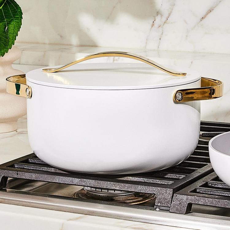 Caraway Home's 6.5 qt. non-stick Dutch Oven (lid included) allows for healthy cooking in the kitchen without harmful chemicals. Your new best friend for pastas, roasts, stews, boils, bread baking, and more. Featuring a ceramic-coated interior, this durable non-stick pot makes cooking easier than ever, cleaning (dare we say) enjoyable, and adds a pop of color to any home.