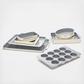 Dimensions (slate): storage rack 1: 20.7 x 5.8 x 8.3 in.; storage rack 2: 20.7 x 5.8 x 8.3 in.; large baking sheet: 20.3 x 13 x 0.9 in.; medium baking sheet: 15 x 9.9 x 0.9 in.; muffin pan: 15.4 x 10 x 1.3 in.; rectangle pan: 15.4 x 9.6 x 2.2 in.; cooling rack: 17.8 x 12.8 x 0.9 in.; square pan: 9.4 x 9.4 x 2 in.; loaf pan: 8.9 x 5 x 2.7 in.; circle pan: 9.3 x 9.3 x 2 in.