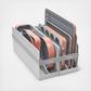Dimensions (gray): storage rack 1: 20.7 x 5.8 x 8.3 in.; storage rack 2: 20.7 x 5.8 x 8.3 in.; large baking sheet: 20.3 x 13 x 0.9 in.; medium baking sheet: 15 x 9.9 x 0.9 in.; muffin pan: 15.4 x 10 x 1.3 in.; rectangle pan: 15.4 x 9.6 x 2.2 in.; cooling rack: 17.8 x 12.8 x 0.9 in.; square pan: 9.4 x 9.4 x 2 in.; loaf pan: 8.9 x 5 x 2.7 in.; circle pan: 9.3 x 9.3 x 2 in.