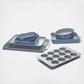 Dimensions (navy): storage rack 1: 20.7 x 5.8 x 8.3 in.; storage rack 2: 20.7 x 5.8 x 8.3 in.; large baking sheet: 20.3 x 13 x 0.9 in.; medium baking sheet: 15 x 9.9 x 0.9 in.; muffin pan: 15.4 x 10 x 1.3 in.; rectangle pan: 15.4 x 9.6 x 2.2 in.; cooling rack: 17.8 x 12.8 x 0.9 in.; square pan: 9.4 x 9.4 x 2 in.; loaf pan: 8.9 x 5 x 2.7 in.; circle pan: 9.3 x 9.3 x 2 in.