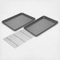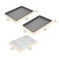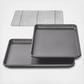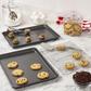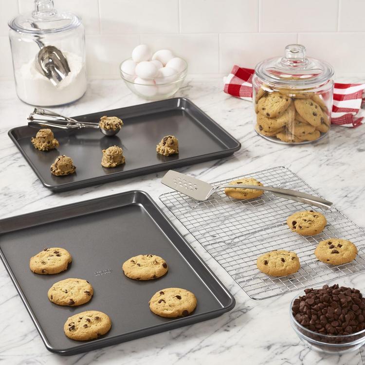The professional line of bakeware makes cooking and baking a delight. The non-stick surface easily releases each recipe and makes clean-up effortless. It's the preferred choice of bakers who understand quality and design, but also want professional-grade durability. This set of cookie sheets/jelly roll pans are ideal for sweet treats like jelly rolls, bars, and cookies but can also be used to make one-sheet-pan meals, roast vegetables, reheat leftovers. The Baking Rack is perfect for cooking bacon in the oven or cooling freshly baked cookies. These pans are made from heavy-weight carbon steel for superior heat conduction and even baking. They features an easy release, silicone based, non-stick coating for ease of baking and cleanup.