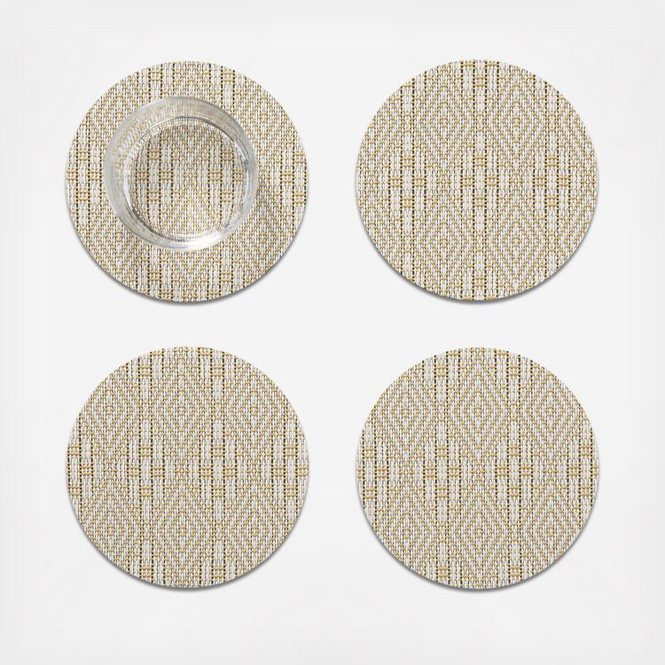 Designed in collaboration with Martha Stewart. This gift-ready set of four coasters is part of a first-of-its-kind collection of inviting and endlessly versatile pieces inspired by the palettes and patterns found in Martha’s own homes. Rich texture to protect and enhance any surface, indoors or outdoors. Boxwood, a lace-like weave developed especially for the Martha Stewart + Chilewich collection, is paired with an integrated moisture barrier and a felt backing.