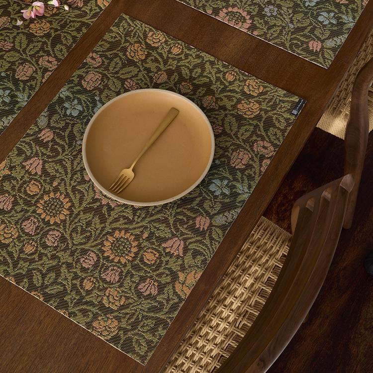 Blending the timeless artistry of historic textiles with contemporary design, our collaboration with The Metropolitan Museum of Art introduces special-edition table mats and rugs inspired by textile works in The Met’s extraordinary collection. Debuting on the birthday of William Morris (March 24), these beautiful and useful foundations celebrate storytelling through pattern and craft. Our design team spent days exploring The Met collection and ultimately selected a trio of 19th-century textiles-by Morris, Emeline Travis Ludington, and Ernestine Eberhardt Zaumseil-for their artistic richness and historical resonance. Each work is reimagined for modern life through the use of TerraStrand yarns that are woven in Alabama into easy-care textiles for indoor/outdoor use.