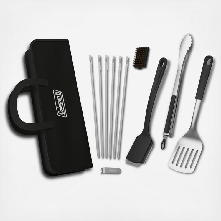 Prepare for your next grilling adventure with the Coleman Cookout 12-piece tool set. Crafted with durable stainless steel and featuring heat-resistant handles, these tools are designed to withstand the high temperatures of your grill. The set comes with a carrying case, allowing you to easily store and transport your tools. One of the highlights of this set is the inclusion of six skewers and a unique skewer removal tool. The skewer removal tool makes it safe and convenient to remove the food from the skewers once they're done cooking. In addition to the skewers, the set also includes 18.25" locking tongs, an 18" spatula, and a Palmyra grill brush with a grill brush refill. The locking tongs are perfect for flipping and serving delicate foods, while the spatula is ideal for flipping burgers, steaks, or even pancakes. The Palmyra grill brush helps you keep your grill grates clean and ready for the next grilling session. With the included grill brush refill, you'll have an extra brush head to keep your grill looking pristine. With its durable construction, versatile tools, and convenient carrying case, this set is the perfect choice for anyone who takes their grilling seriously.