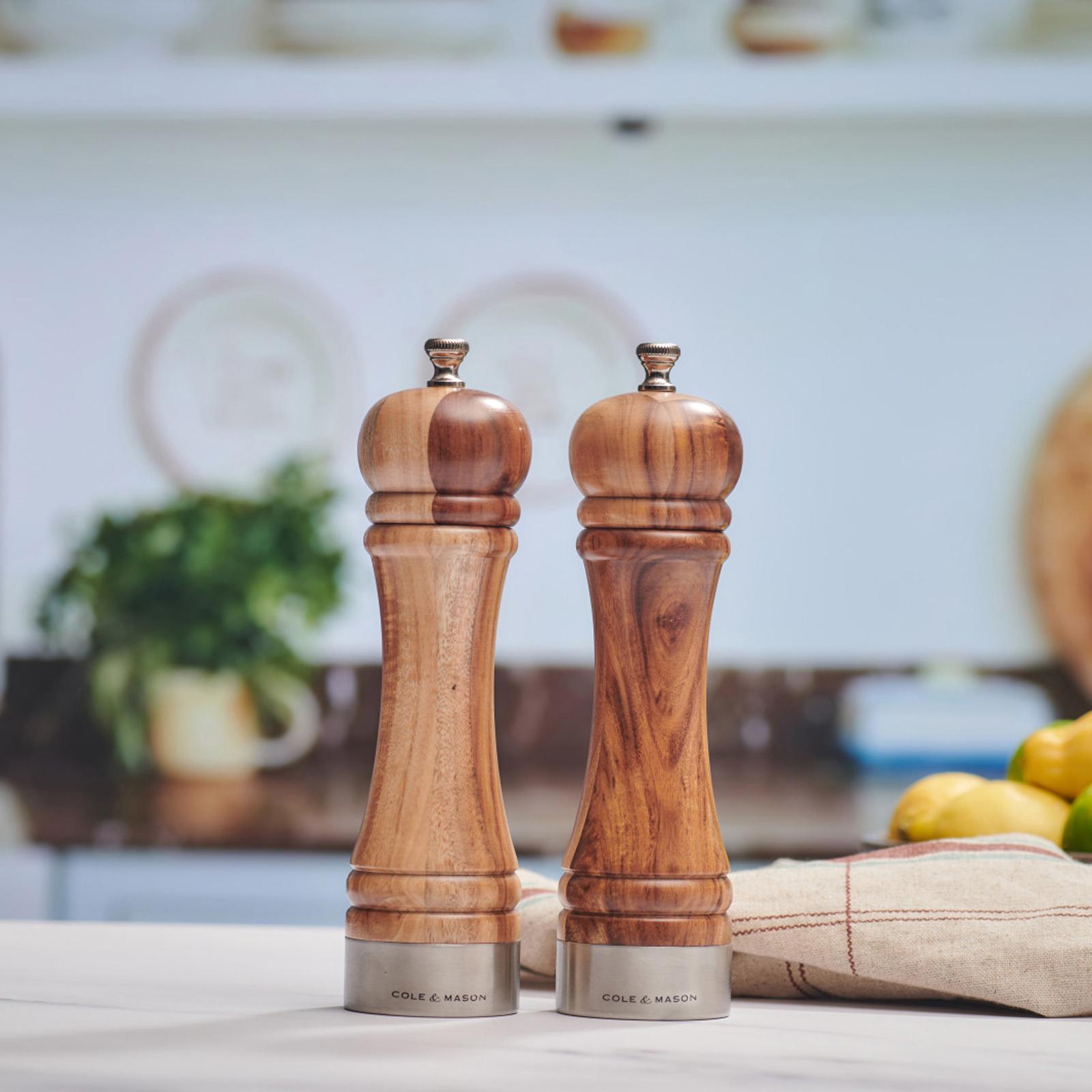 Made from high-quality acacia wood with metal accents, the elegant and tactile Camden salt and pepper grinder set will be sure to elevate any dining table Both salt and pepper mill feature Cole & Mason sharp ceramic grinding mechanism. Grinders are covered by a two-year guarantee. You can easily adjust the salt or pepper grind by tightening or loosening the knob on top of the mill. To refill the grinders, unscrew the knob and pull off the top. The grinders are presented in a plastic free, carton box, making this set an ideal gift. Hints & tips: If your grinder becomes difficult to grind, particularly on a fine setting, trying clearing the mechanism by loosening the knob underneath the mill to the coarsest setting and twist the top. This will free any large salt crystals that may have become lodged. Retighten the knob to the desired setting but be sure to never fully tighten the knob.