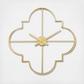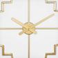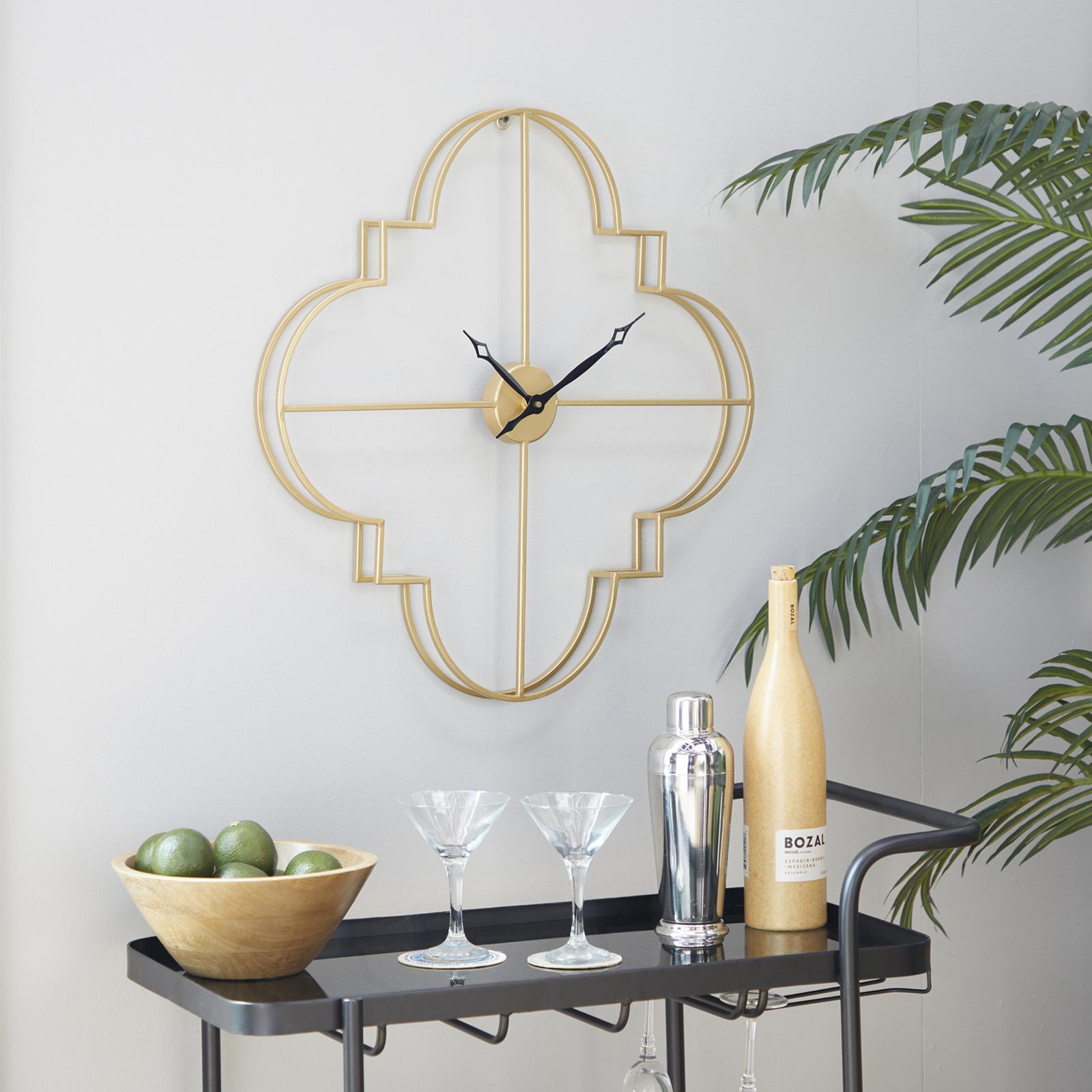 Add a touch of luxury with this gold wall clock for home in your living room or entryway, effortlessly blending style and function. Requires 1 AA battery, not included. This item ships in 1 carton. Clock face has gold hands and no hashmarks or numbers. The clock mechanism runs silent. Can be hung vertically using the metal rings; nails and screws not included. Suitable for indoor use only. This item ships fully assembled in one piece. This is a single gold colored kitchen clock. Glam style.