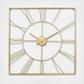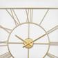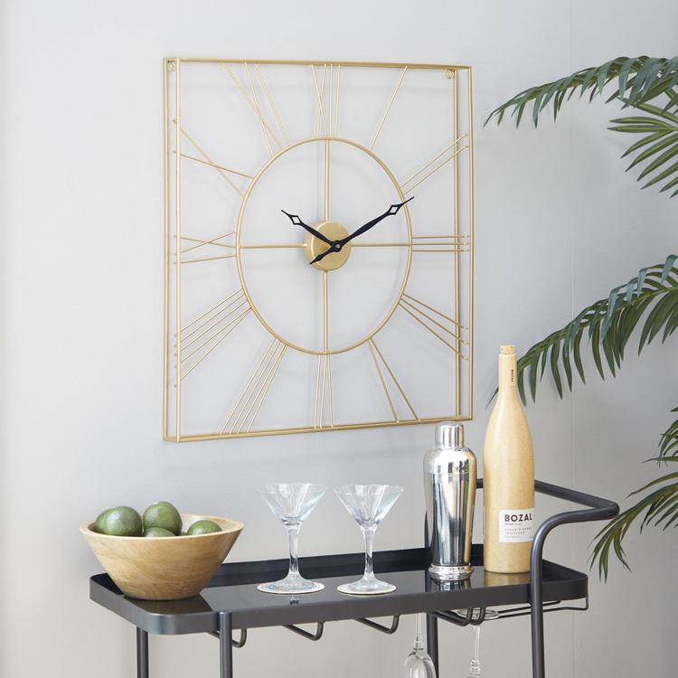 Add a touch of luxury with this gold wall clock for home in your living room or entryway, effortlessly blending style and function. Requires 1 AA battery, not included. This item ships in 1 carton. Clock face is has a round design with Roman numerals for the hour markers. The clock mechanism runs silent. Can be hung vertically using the metal rings; nails and screws not included. Suitable for indoor use only. This item ships fully assembled in one piece. This is a single gold colored kitchen clock. Glam style.
