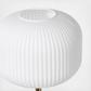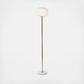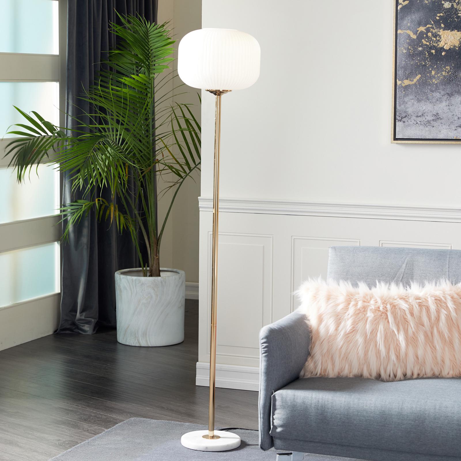Add soft, ambient light to your entryway, living room, or bedroom with this cool and modern white orb floor lamp. The frosted white glass shade is a rounded square shape with ribbing and bulb that is inserted within the white plastic housing that secures your glass shade. This glowing orb is perched on a long metallic gold iron stem that conceals your cord, which flows out of the white and gray marble base, complete with a foot switch for your convenience. Uses standard E26 bulb (not included). This item has a 72” cord length. . Convenient foot switch on cord for easy on/off function. Marble is a product of nature and no two pieces are exactly alike, it is prone to variations in color and/or patterns in the material that adds to the beauty and charm of the piece.