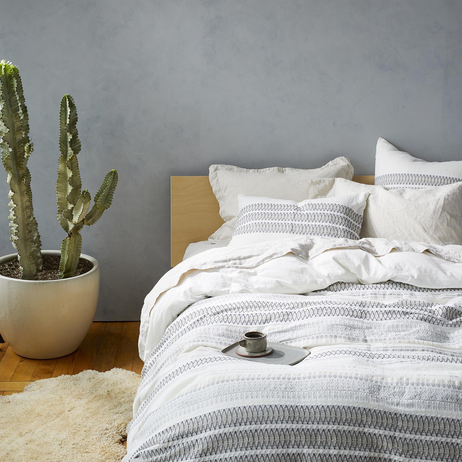 Pure organic cotton drapes the bed in dobby-woven diamond stripes that capture the colors and textures of the place where land meets sea. Soft and substantial, this duvet has a relaxed, welcoming style and tremendous versatility, so it’s a great choice for year-round use. It is backed with smooth plain-woven cotton, making it comfortable with or without a top sheet. Made in a factory that recycles its wastewater. Finished with a simple knife-edge, an 8 in. interior flap and coconut shell buttons. Inside ties.