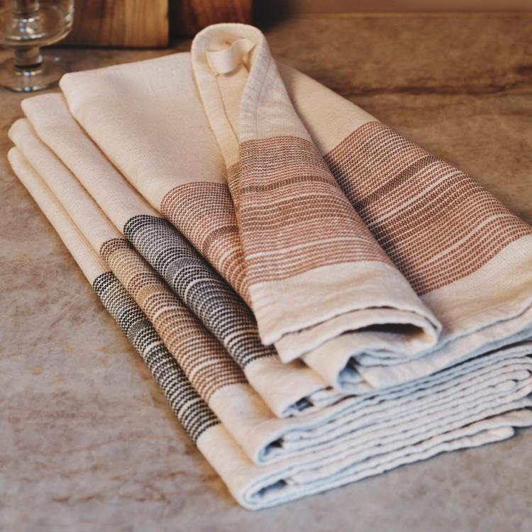 Upgrade your kitchen with our Miraloma Organic Kitchen Towels. Designed for durability and daily use, they feature a unique thick-and-thin yarn weave that creates ombré horizontal stripes, delivering both texture and style. Made from soft, highly absorbent organic cotton, these towels are not only effective at drying but also maintain their color over time thanks to yarn dying.