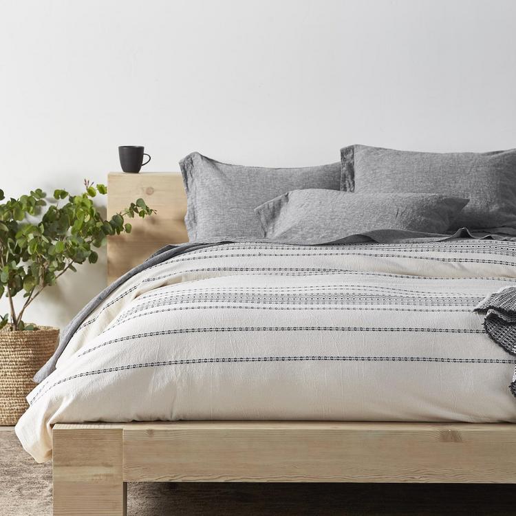 Textural, dobby-woven stripes traverse soft, organic cotton to create a duvet cover that’s vibrant yet versatile. Prewashed for softness, it'll look as relaxed and inviting years from now as it does today. Self-backed and finished with a simple knife-edge and coconut shell buttons. Inside ties. Cotton is 100% organic, and sourced and woven in India.