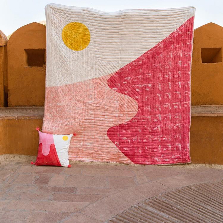 This reversible, hand-printed quilt is made from 100% cotton and requires attention from four artisans, including wood carvers, block printers, quiltmakers, and dye specialists. The design is hand-pressed onto each quilt using hand-carved wooden blocks dipped in dyes. The printed cotton shells are brought to the homes of quiltmakers, who stuff and stitch the quilts by hand, creating the final product. CQC LA quilts are made in small batches. Due to the handcrafted nature of this item, expect slight variations in the appearance of each unique piece.
