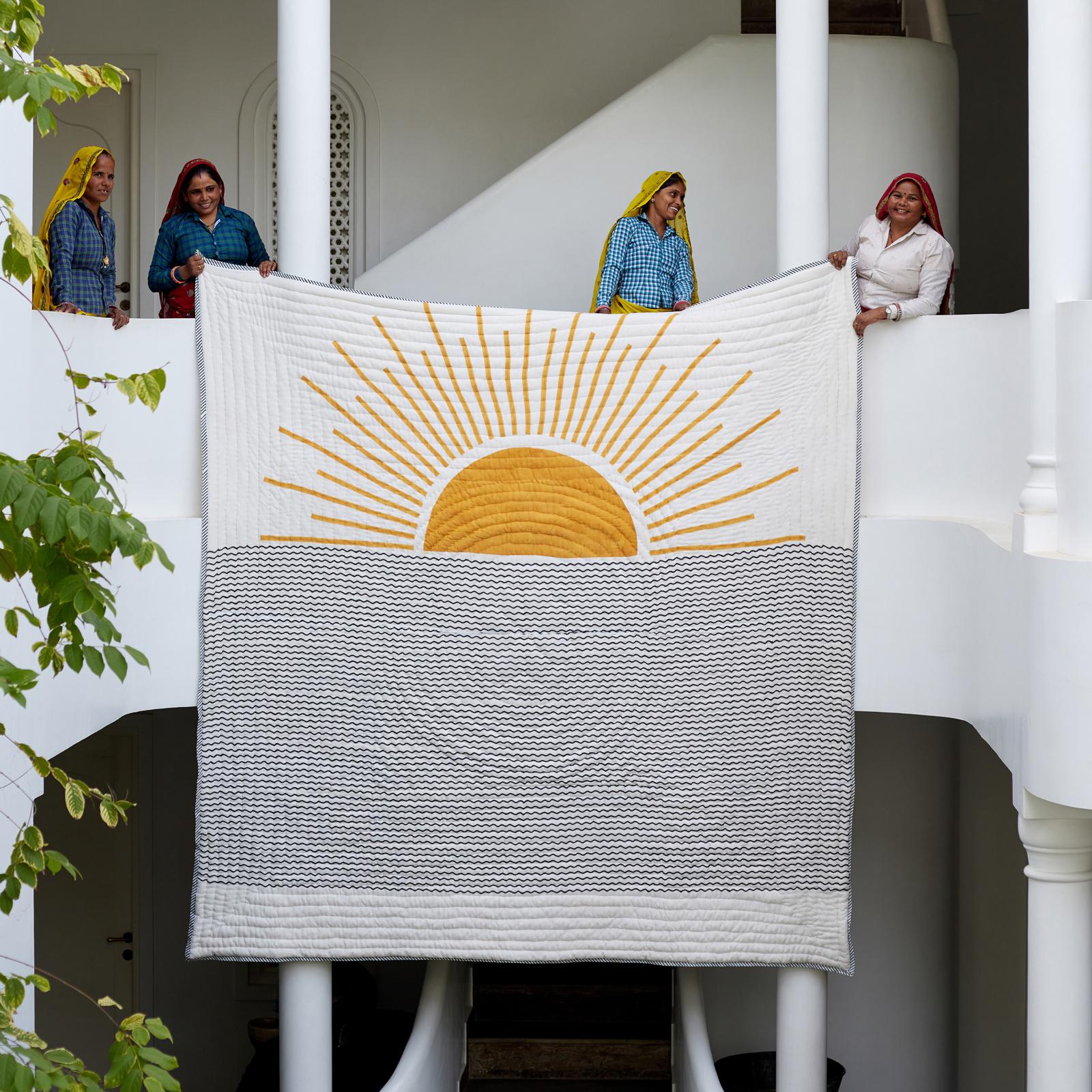This reversible, hand-printed quilt is made from 100% cotton and requires attention from four artisans, including wood carvers, block printers, quiltmakers, and dye specialists. The design is hand-pressed onto each quilt using hand-carved wooden blocks dipped in dyes. The printed cotton shells are brought to the homes of quiltmakers, who stuff and stitch the quilts by hand, creating the final product. CQC LA quilts are made in small batches. Due to the handcrafted nature of this item, expect slight variations in the appearance of each unique piece.