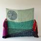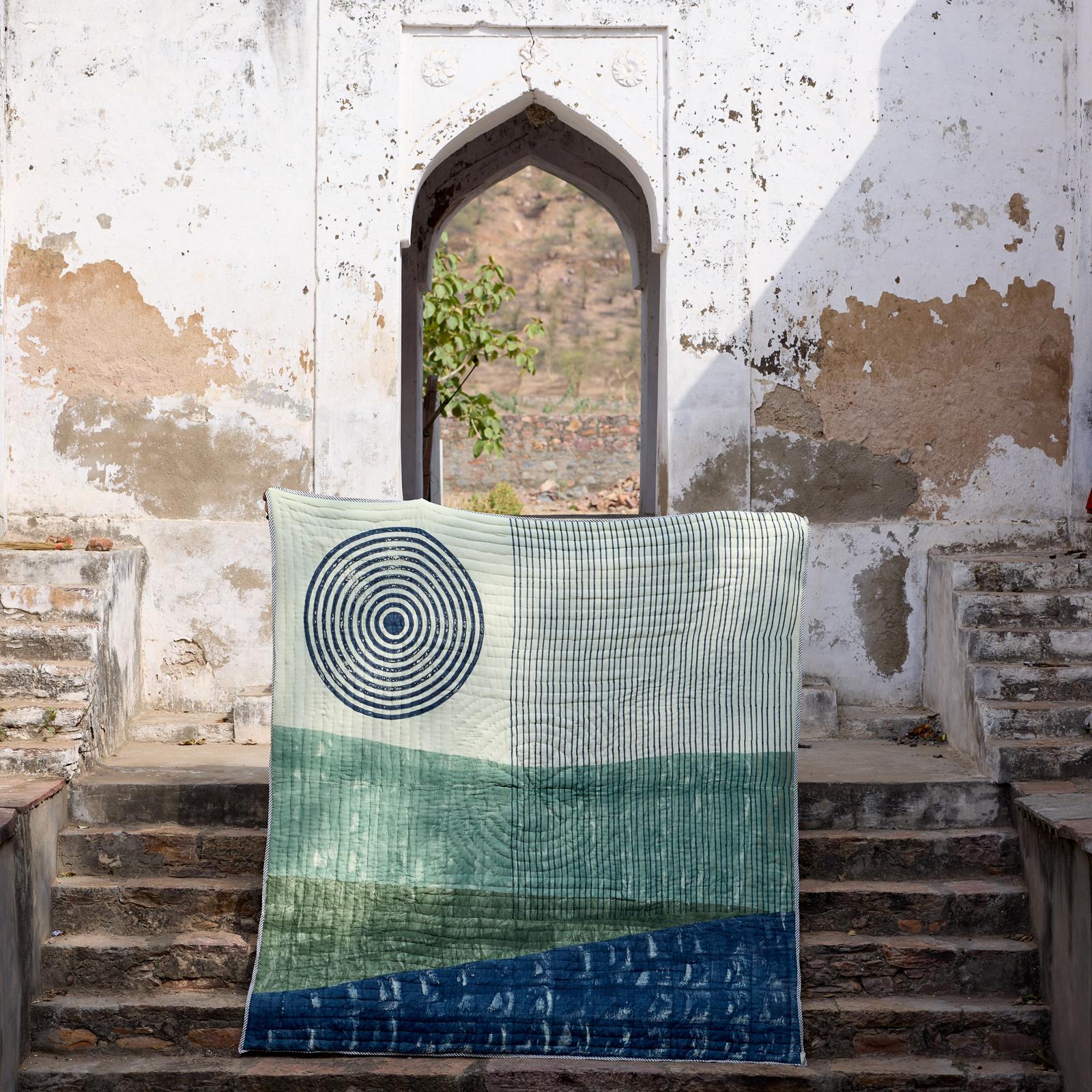 This reversible, hand-printed quilt embodies minimalist modern aesthetics: one side showcases black abstract shapes on a wheat base, while the reverse highlights abstract shapes in orange and brown on a yellow backdrop. Each quilt is handmade from 100% cotton and requires attention from four artisans, including wood carvers, block printers, quiltmakers, and dye specialists. The design is hand-pressed onto each quilt using hand-carved wooden blocks dipped in dyes. The printed cotton shells are brought to the homes of quiltmakers, who stuff and stitch the quilts by hand, creating the final product. CQC LA quilts are made in small batches. Due to the handcrafted nature of this item, expect slight variations in the appearance of each unique piece.