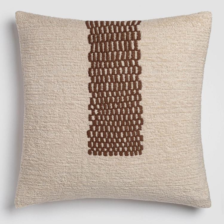 Featuring a cozy off-white chenille base and abstract checkered brown embroidery, this decorative pillow delivers a harmonious blend of softness and structure. Ideal for grounding minimal and earthy decor styles.