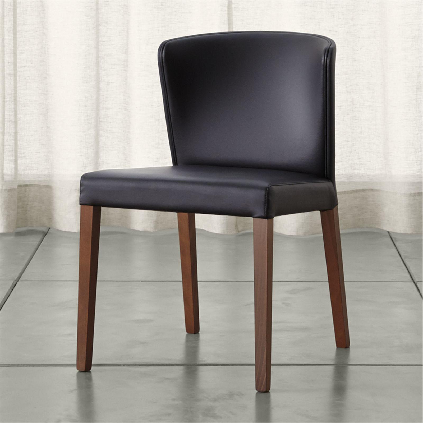 Sleek Italian design cradles comfort with a gracefully curved back that hugs the body. Upholstered in rich, pebble-textured synthetic leather in classic black, Curran offers the look and feel of the real thing, with the added bonus of easy care and exceptional durability. Self-welting traces the side chair’s angled profile, accenting its gently rounded back. A walnut finish to the clean-lined, solid beech legs adds warm contrast. The Curran Black Side Chair is a Crate and Barrel exclusive.