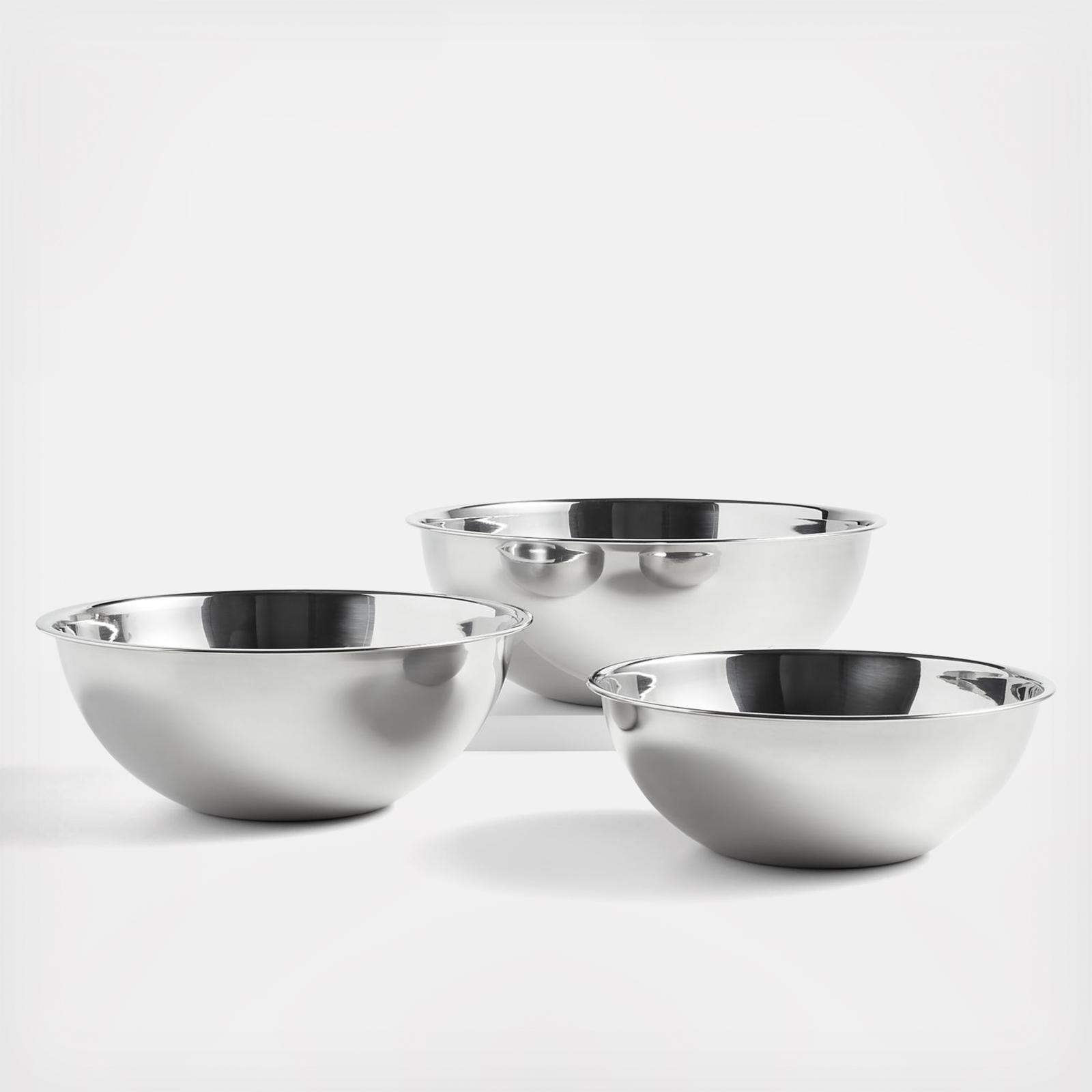 The pros know bowls. This set boasts all of the qualities professional cooks treasure: high-quality stainless steel construction, a wide-open design for easy mixing, pronounced rims for a sturdy grip and dishwasher-safe durability. The bowls also bring a classic, industrial beauty to your home kitchen. A Crate & Barrel exclusive, set of three bowls nests for compact storage and looks fantastic on open shelving.
