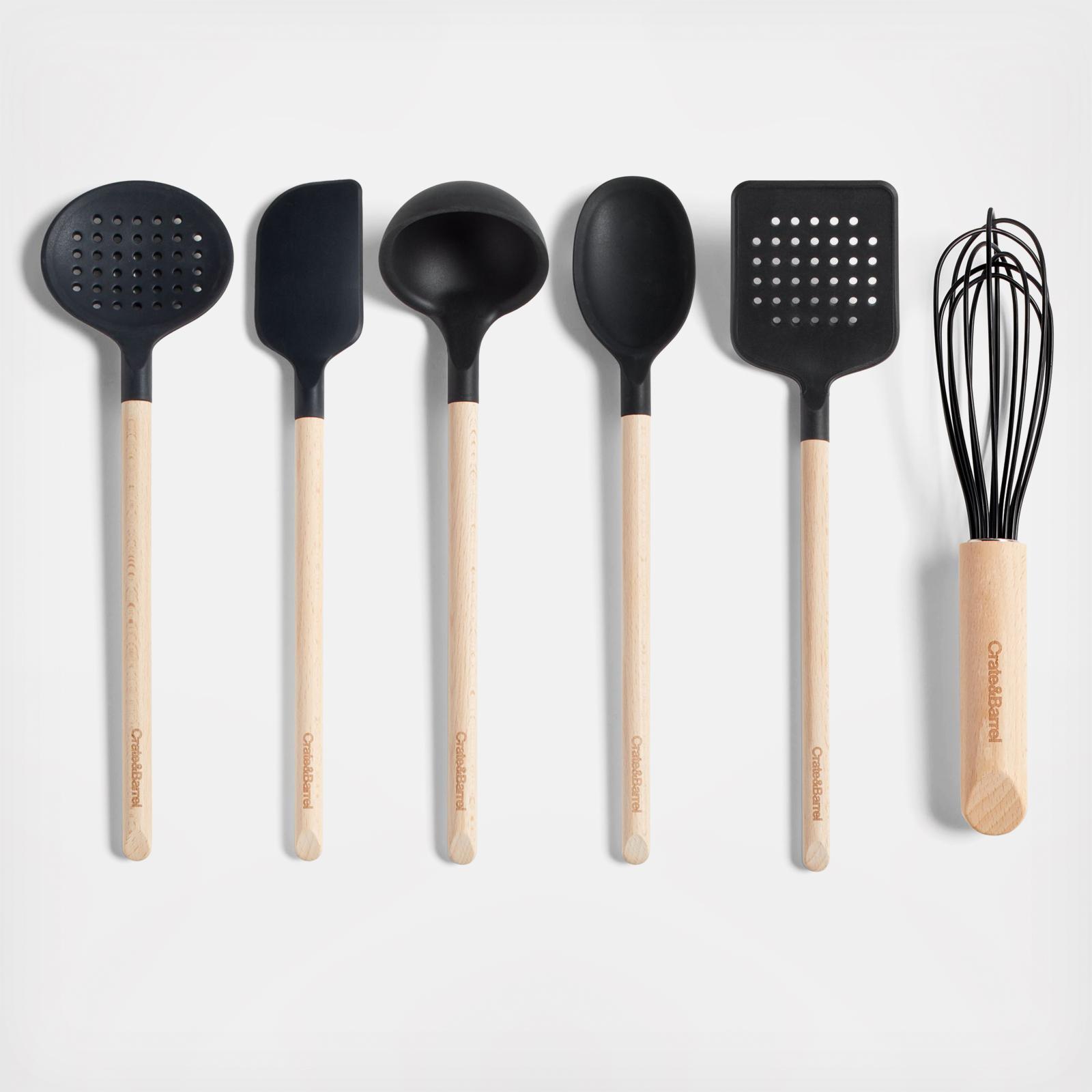 Stir, scoop, serve, scrape, flip and mix with our signature silicone and wood utensils. Constructed with nylon cores for strength, the white silicone heads ably spread the thickest batters, flip and serve the heartiest potato pancakes or fold the most delicate meringues. Their flexible, tapered edges scrape the bowl, blender or pan perfectly clean, and soft-touch silicone won't damage non-stick cookware and resists stains, scratches and heat up to 600 degrees. Natural beechwood shapes cylindrical handles for a sturdy grip and a warm, classic look. We love the way the refined beveled edges finish the elongated handles with a dynamic detail. Create your own collection of Crate & Barrel utensils for a well-outfitted workspace that's up to any cooking challenge.