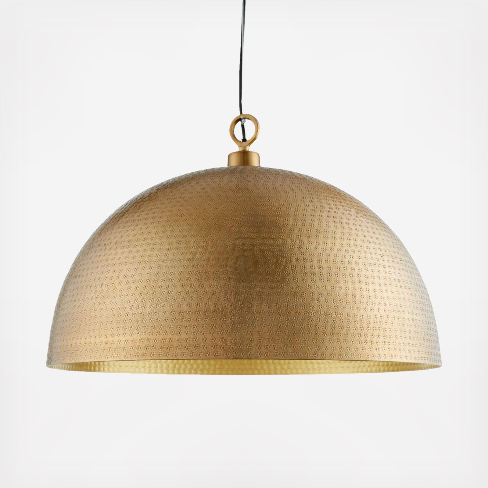 A hammered brass dome pendant adds clean geometry and warm beauty to any space, its brass interior reflecting light with a cozy glow. Hang one above a brass bar cart, two in the bedroom over the bedside tables or three above a kitchen island. Gorgeously textured with timeless, worldly appeal, the softly rounded pendant hangs from an iron ceiling plate finished in brass to match the aluminum dome. A petite loop accents this exclusive brass dome hammered metal pendant light.