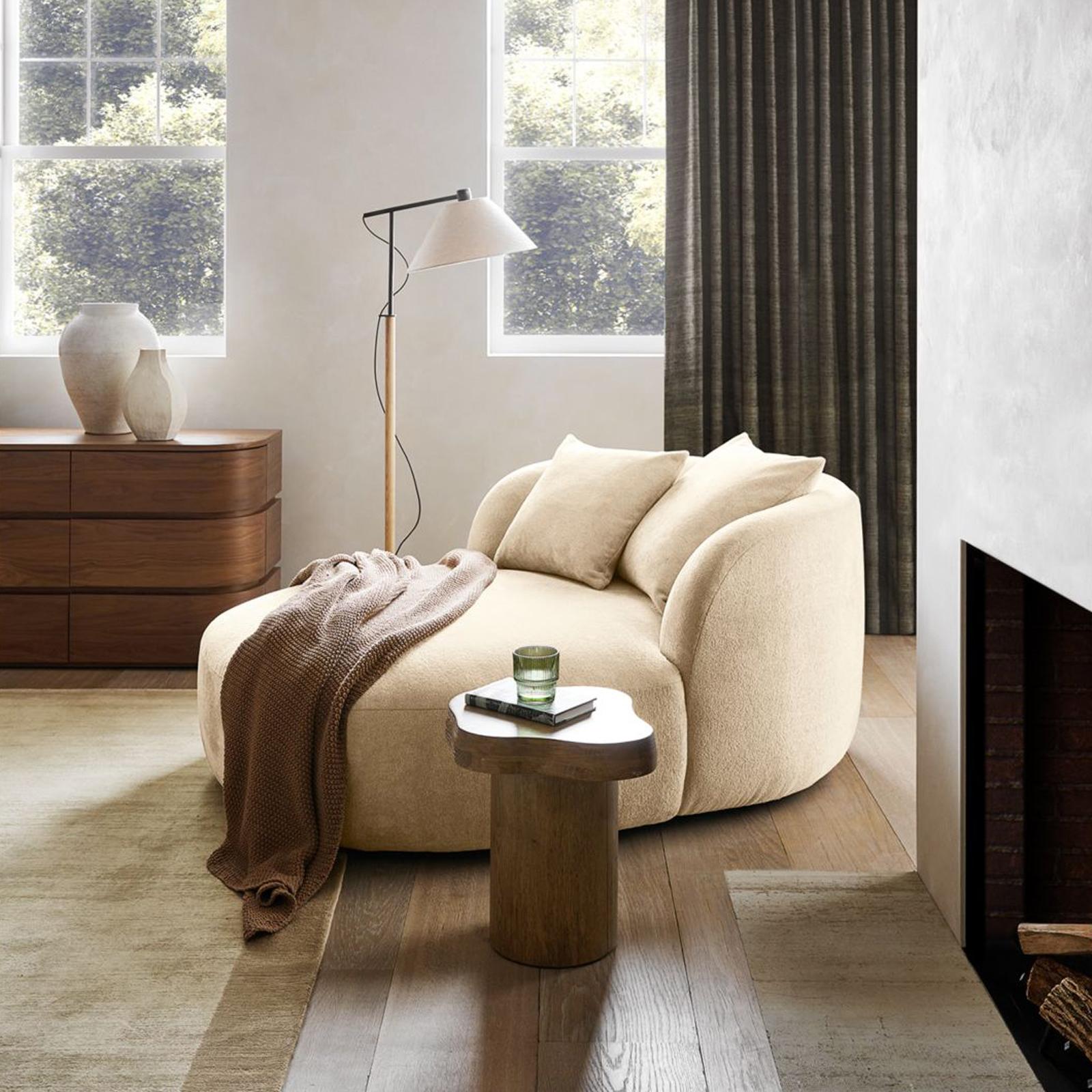 Our Sogno chaise lounge relaxes with oversized proportions and cozy cushioning for a high-design retreat where comfort is king. Styled with rounded contours and continuous curves, the pillowy chaise is upholstered in a fuzzy, high-pile chenille weave. Scaled casual and oversized for extra seating options, the chaise lets you choose your lounge - propped up against the armchair back or full-out horizontal. Whichever position you take, two differently sized throw pillows make sure your sit is properly snuggled.